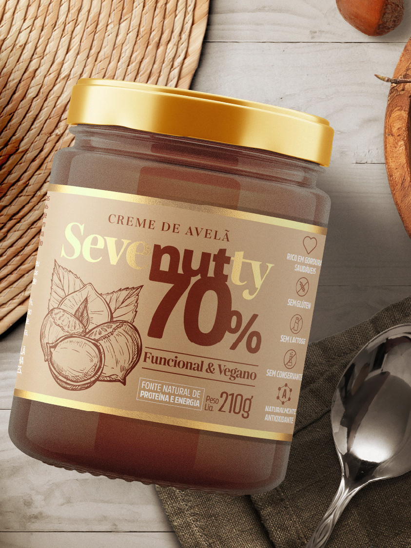Projeto de Identidade Visual e Embalagem para creme de avelã saudável Sevenutty.