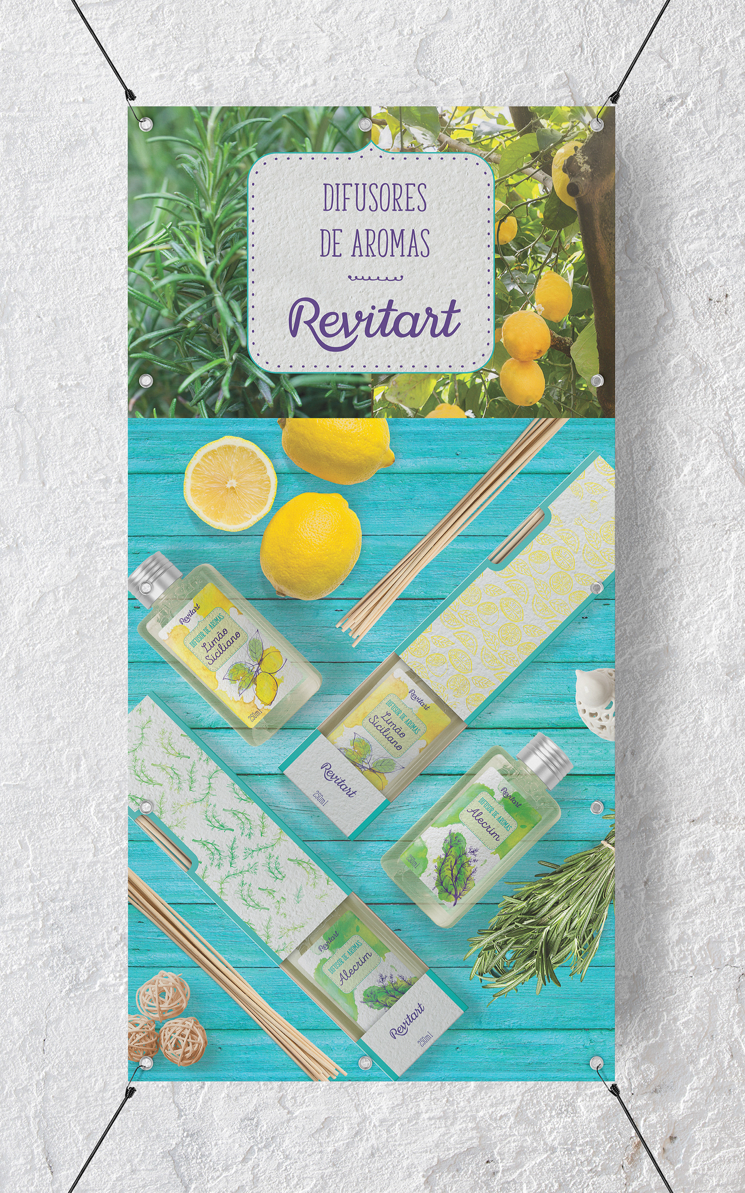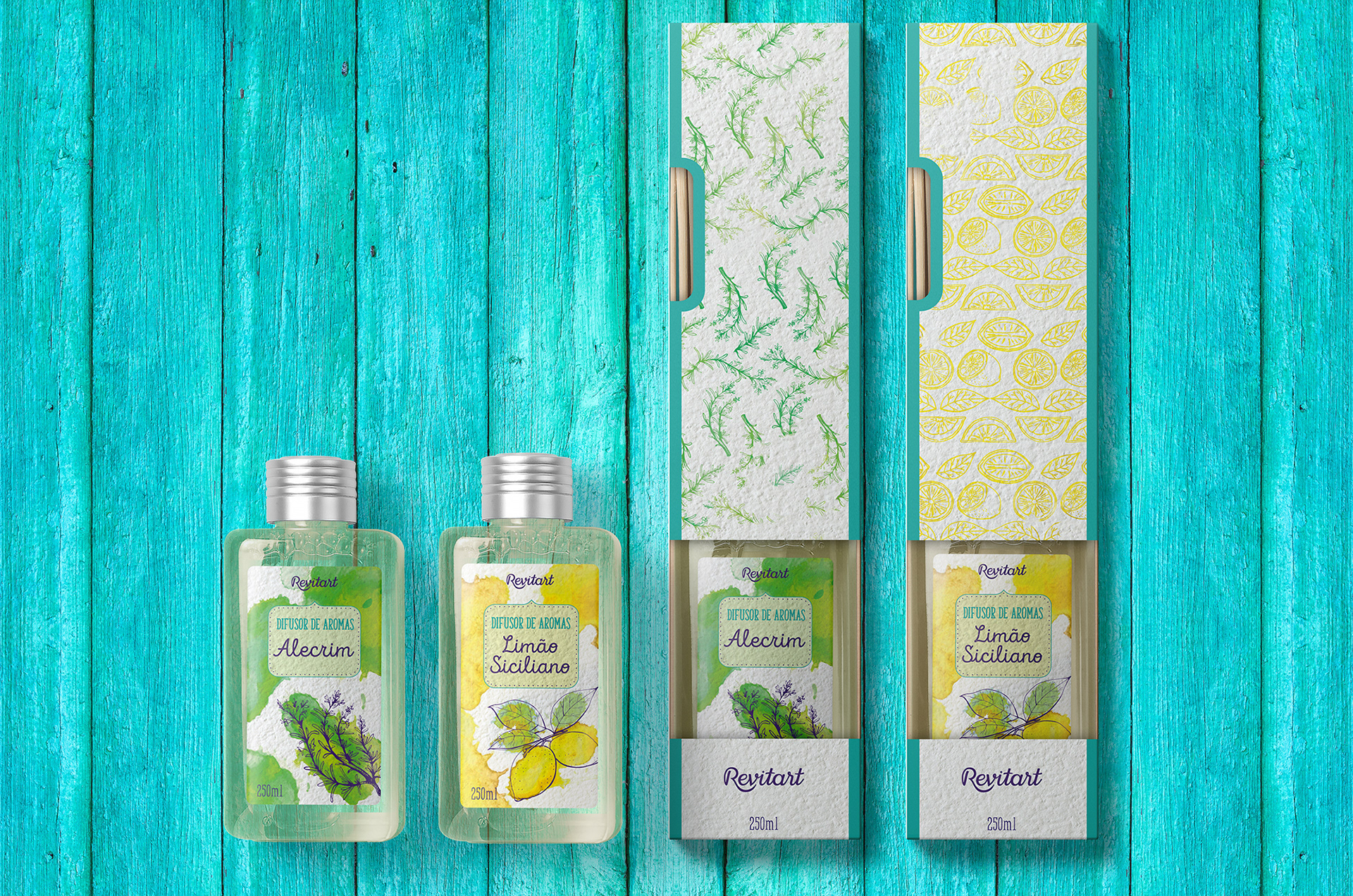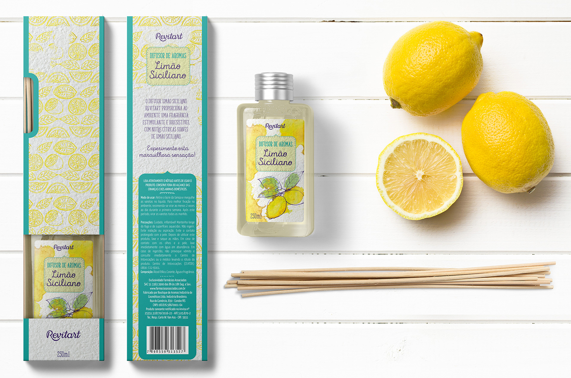 Criação de embalagens para difusores de aromas da marca Revitart - Farmácias Associadas.